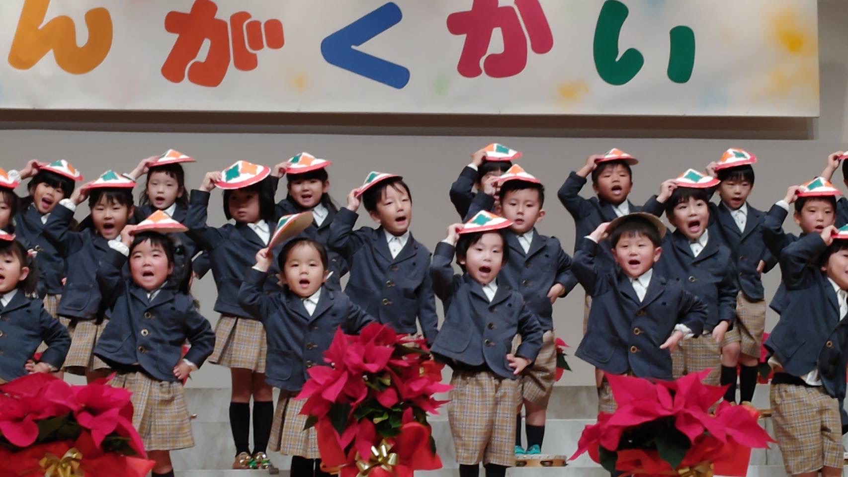 「茶摘み」をうたいながら、すげの笠をかぶって元気に発表しました。