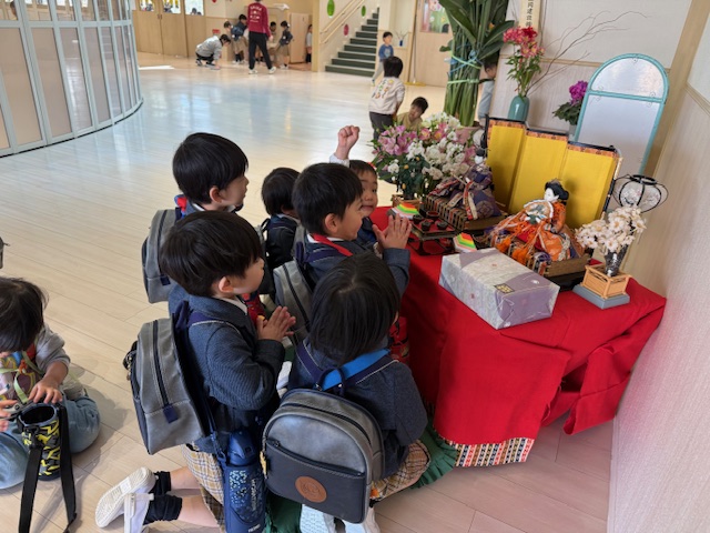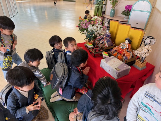 ひな人形の前におともだちが集まってきました・・・