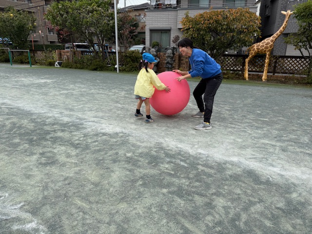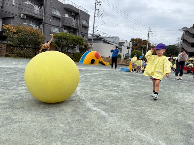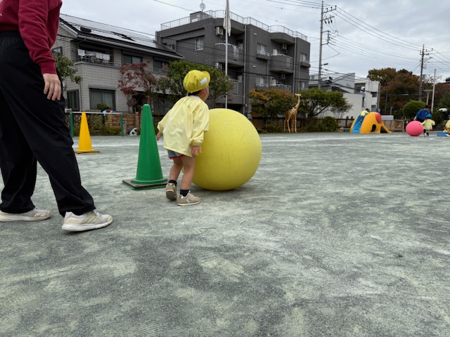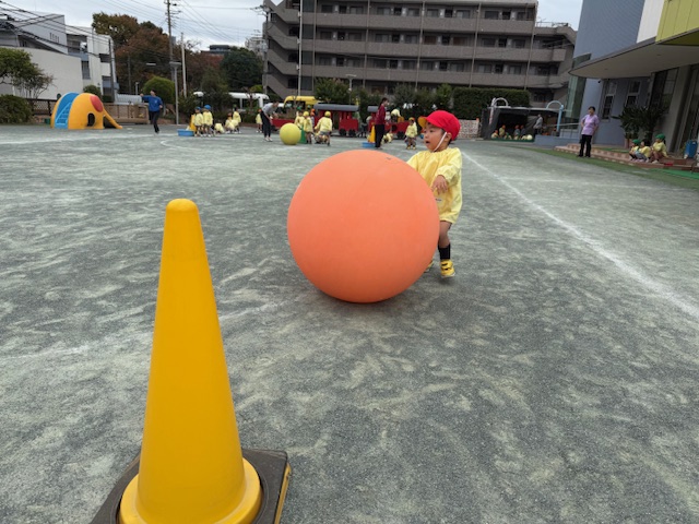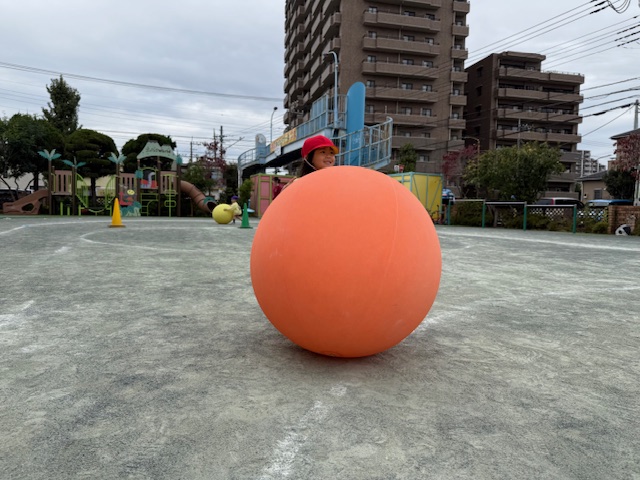 年少さんは、自分よりも大きな大玉を転がしています